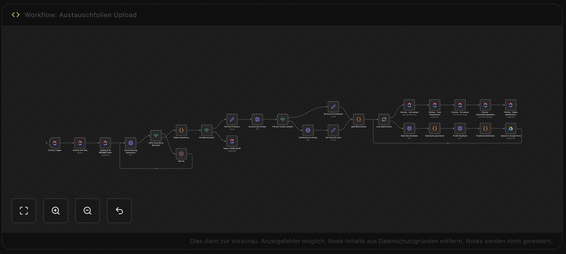 Automatisierte Auswertung gescannter Papier-Fragebögen (bis 2.000 Seiten) mit Azure Document Intelligence. n8n orchestriert den Flow: ClickUp-Trigger, Dokumenten-Erfassung aus Google Drive, OCR mit Checkbox-Erkennung, automatische Kompensation von Scanner-Verschiebungen (Offset-Berechnung), Confidence-Scoring pro Feld, statistische Auswertung in Code-Nodes, strukturierte Excel-Reports auf Google Drive.