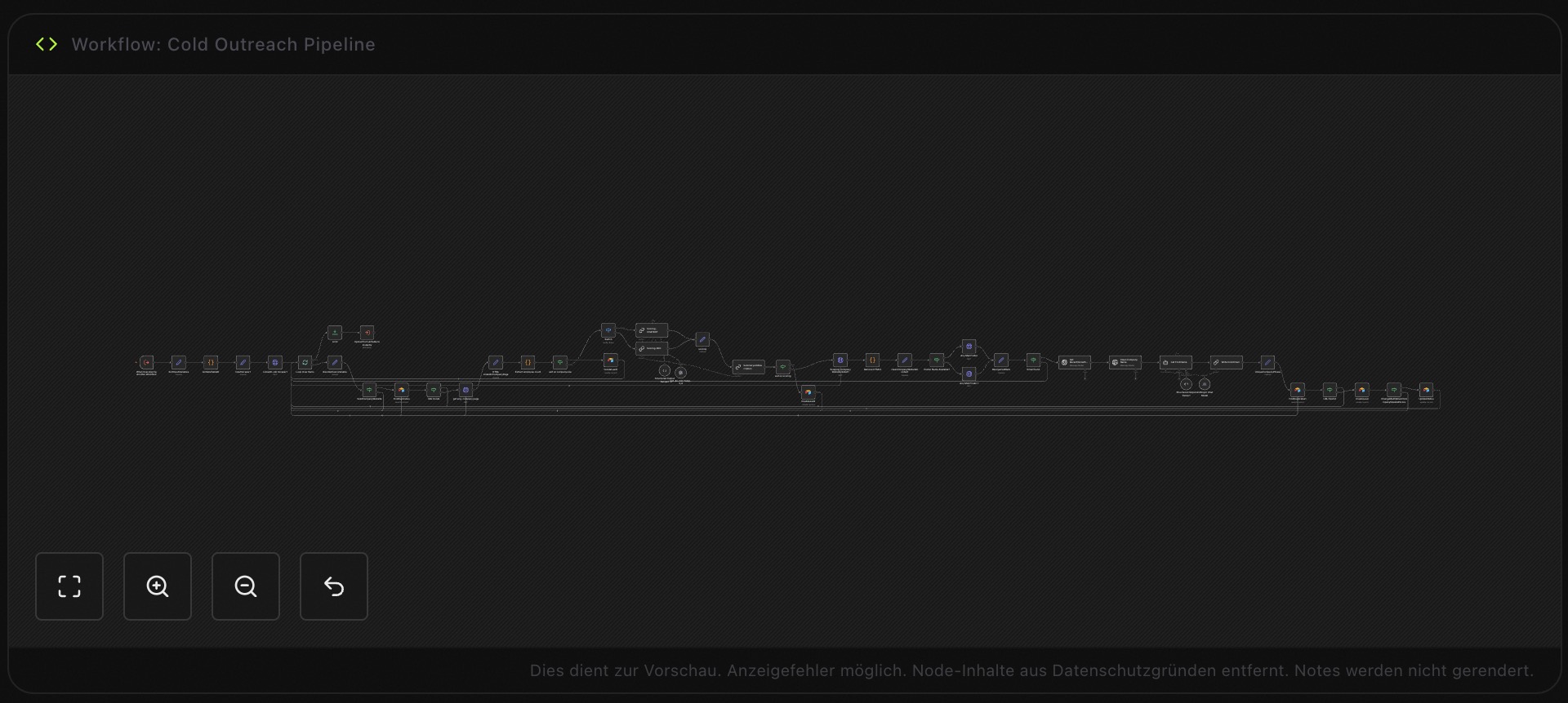 11-stufige Pipeline: LinkedIn Job Scraping via Apify, Duplikat-Prüfung gegen Airtable, Company-Enrichment, KI-basiertes Lead Scoring mit GPT-4o-mini (0-10 Skala, zwei Produktkategorien), Website-Analyse, E-Mail-Finder, personalisierte Cold Emails mit Claude 3.5 Sonnet, Airtable-Speicherung, Instantly-Übergabe. Frühzeitiges Filtern spart API-Kosten.