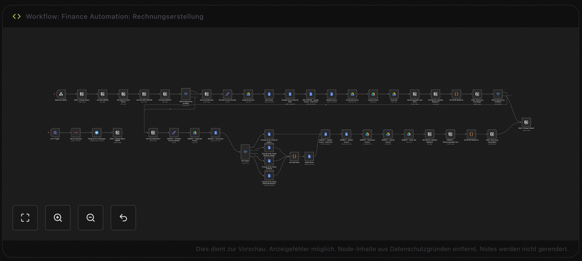 n8n-Workflow mit 6-Phasen-Pipeline: Webhook-Trigger aus Notion, automatische Stammdaten-Sammlung, Switch-basierte Entscheidungslogik für 3 Rechnungstypen, intelligente Umsatzsteuer-Logik mit 4 Szenarien (DE 19%, EU Reverse Charge, Drittland, Kleinunternehmer). Code-Nodes analysieren Google Docs programmatisch und löschen Tabellenzeilen über die API. Automatische Rechnungsnummer-Vergabe, deutsche Zahlenformatierung, bidirektionale Notion-Verknüpfungen. Fehler werden via Telegram gemeldet.