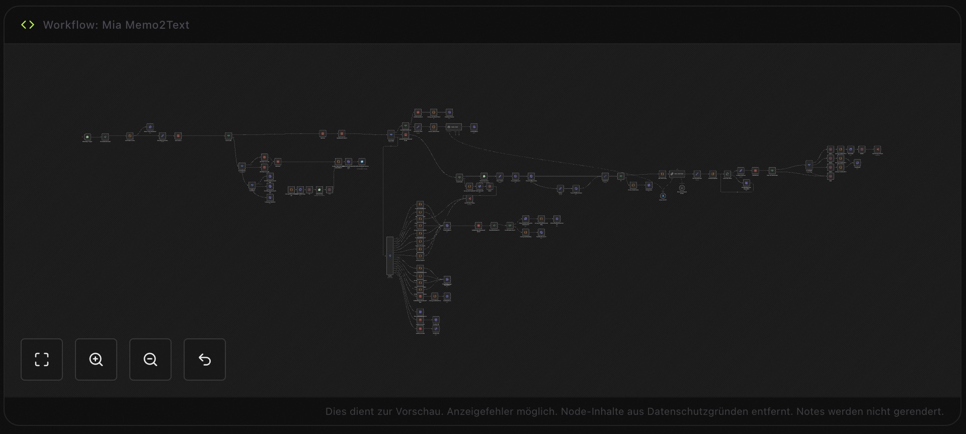 n8n orchestriert den kompletten Pipeline-Flow: Webhook-Empfang über WhatsApp Business API, Routing an self-hosted Whisper-Instanz, Retry-Logik bei Transkriptions-Fehlern, GPT-4 für strukturierte Ausgabe (Summary, To-Dos, Antwortvorschlag) mit Output-Validierung, Stripe-Webhook-Handling für Subscription-Management.